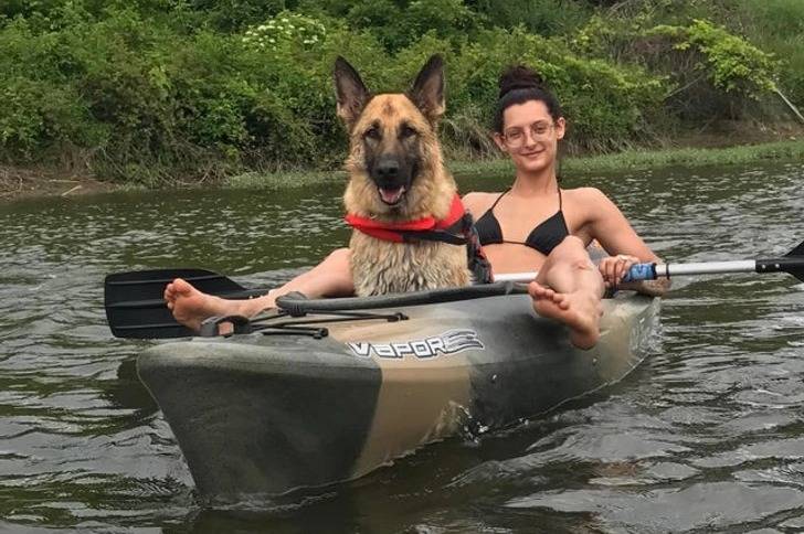 Un king Shepherd assis dans un kayak, et portant un gilet de sauvetage