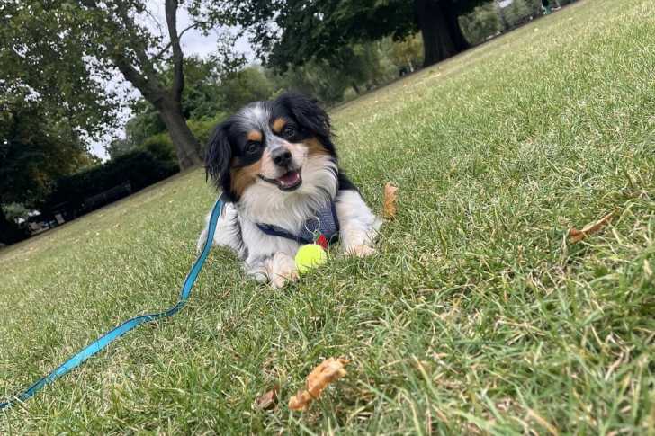 Un Kokoni allongé sur une surface gazonnée et qui est tenu en laisse