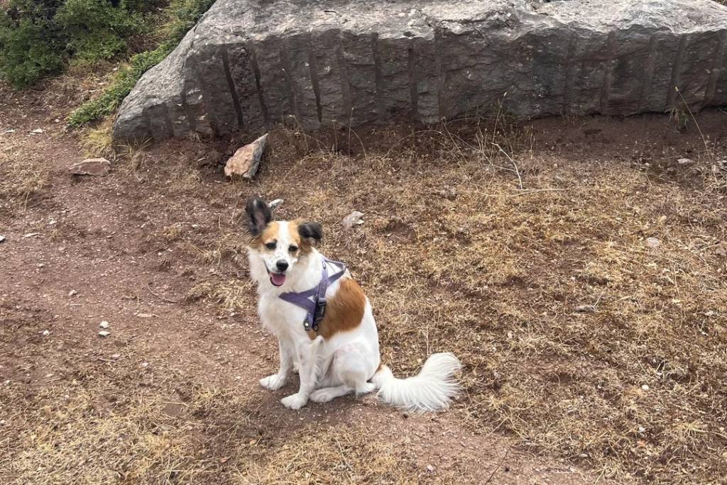 Un Kokoni assis sur un terrain herbeux et portant un harnais