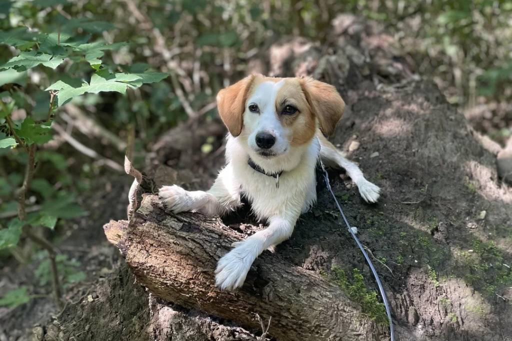 Un Kokoni allongé sur un tronc d'arbre et qui est tenu en laisse