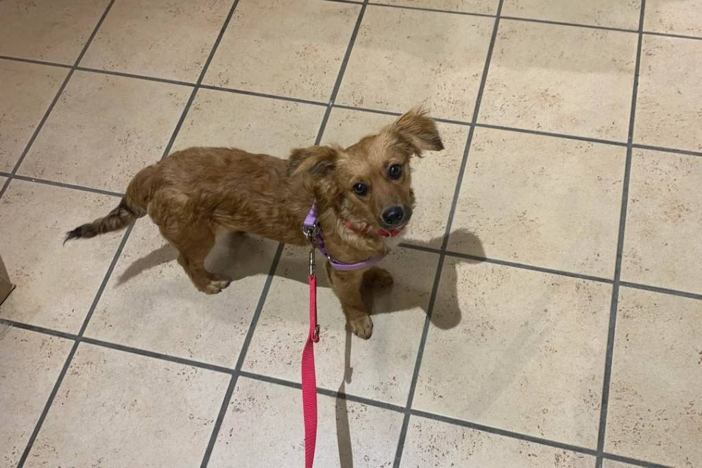 Un Kokoni sur un sol carrelé et qui est tenu en laisse