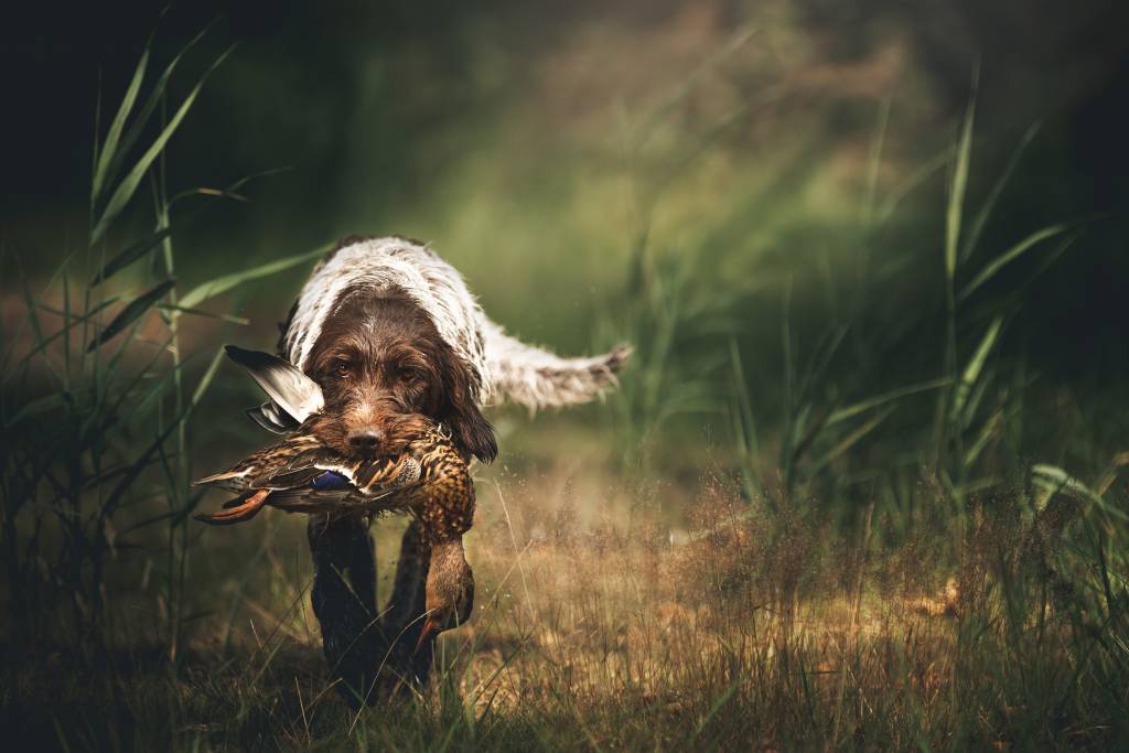 Un Korthals à l'arrêt devant un pigeon dans son jardin