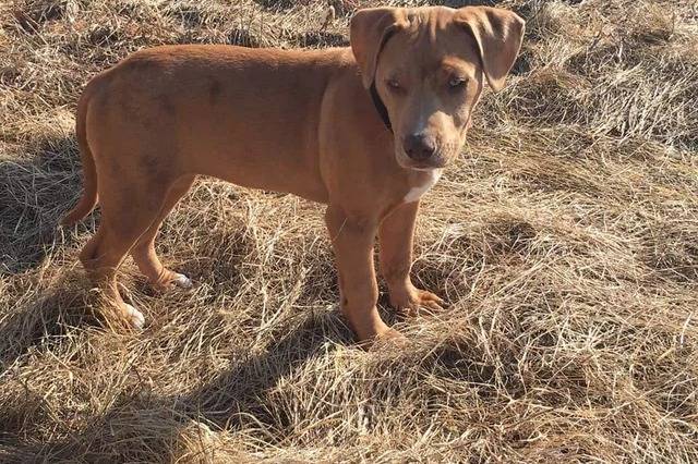 Un Labahoula sur une surface herbacée et portant un collier autour du cou