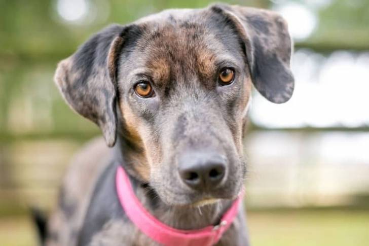 Un Labahoula portant un collier autour du cou et regardant vers la caméra