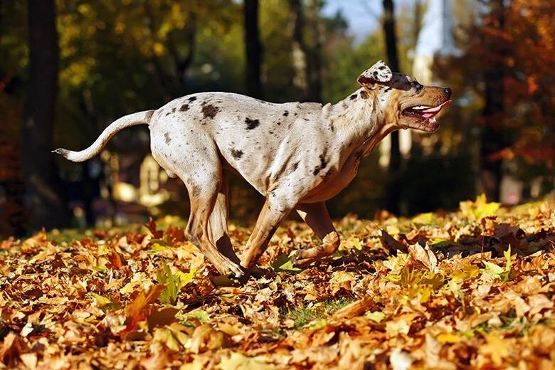 Profil d'un Labahoula courant sur un sol jonchés de feuilles mortes et ayant la gueule ouverte