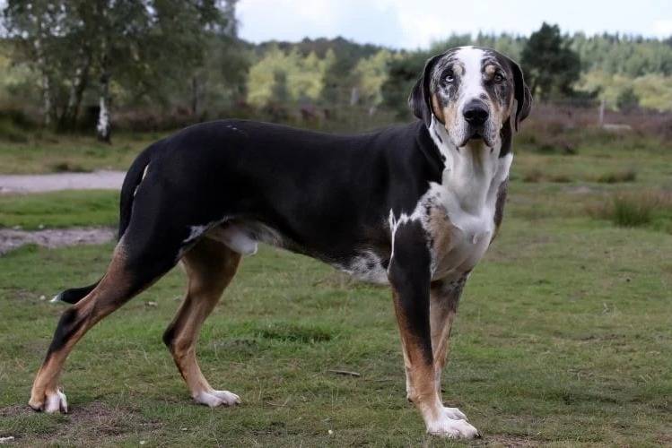 Un Labahoula sur un terrain herbeux et regardant vers la caméra