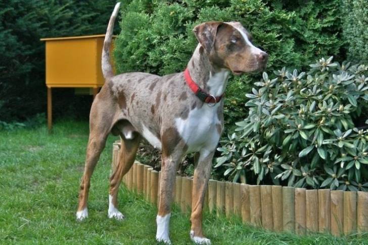 Un Labahoula sur un terrain gazonné et portant un collier autour du cou