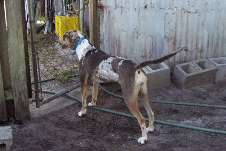 Un Labahoula au pelage tricolore portant un collier autour du cou