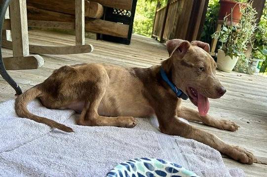 Un Labahoula allongé sur une serviette et portant un collier autour du cou