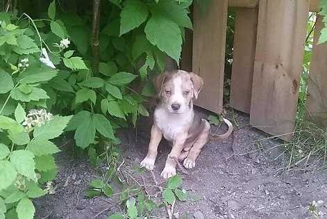 Un Labahoula assis sur une surface sableuse et regardant vers la caméra