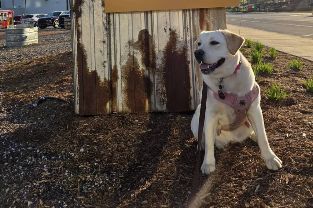 Un Labernois assis sur un terrain herbeux et tenu en laisse