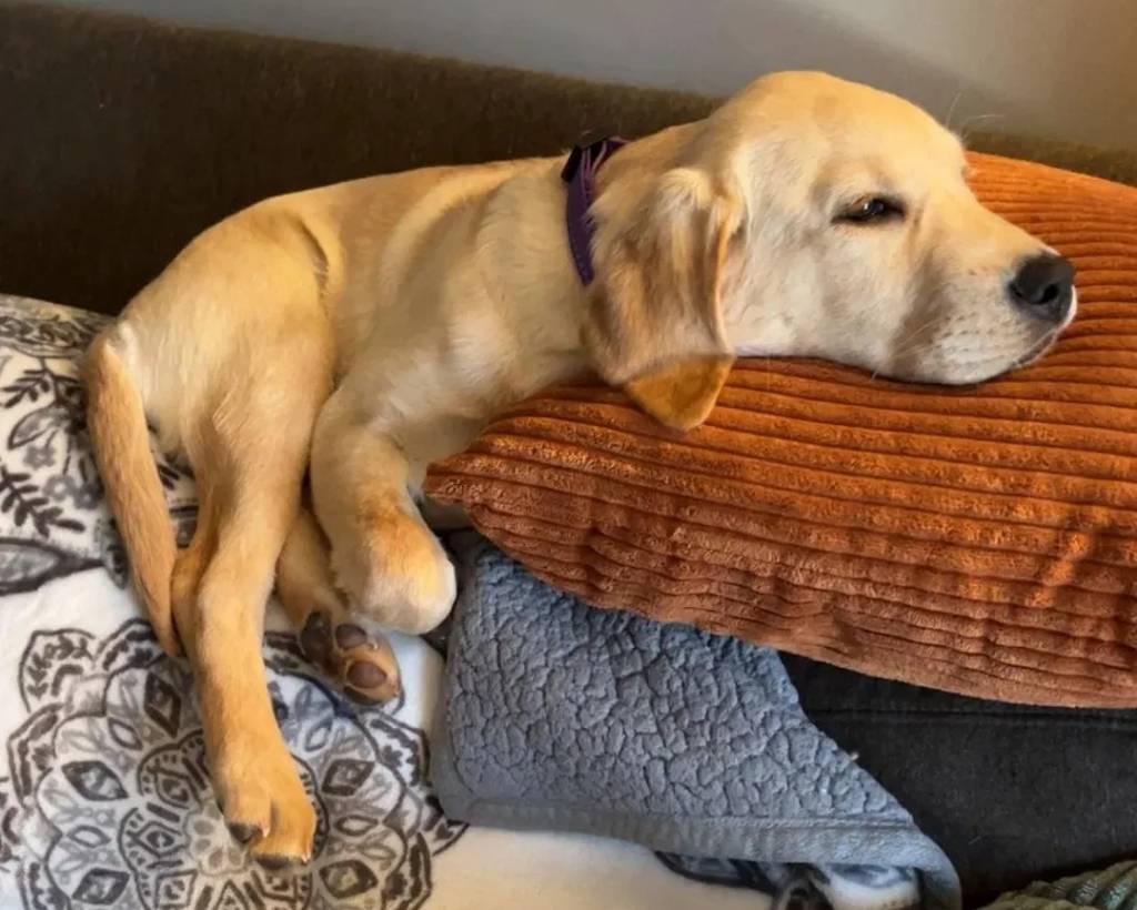 Un Labernois allongé et portant un collier autour du cou