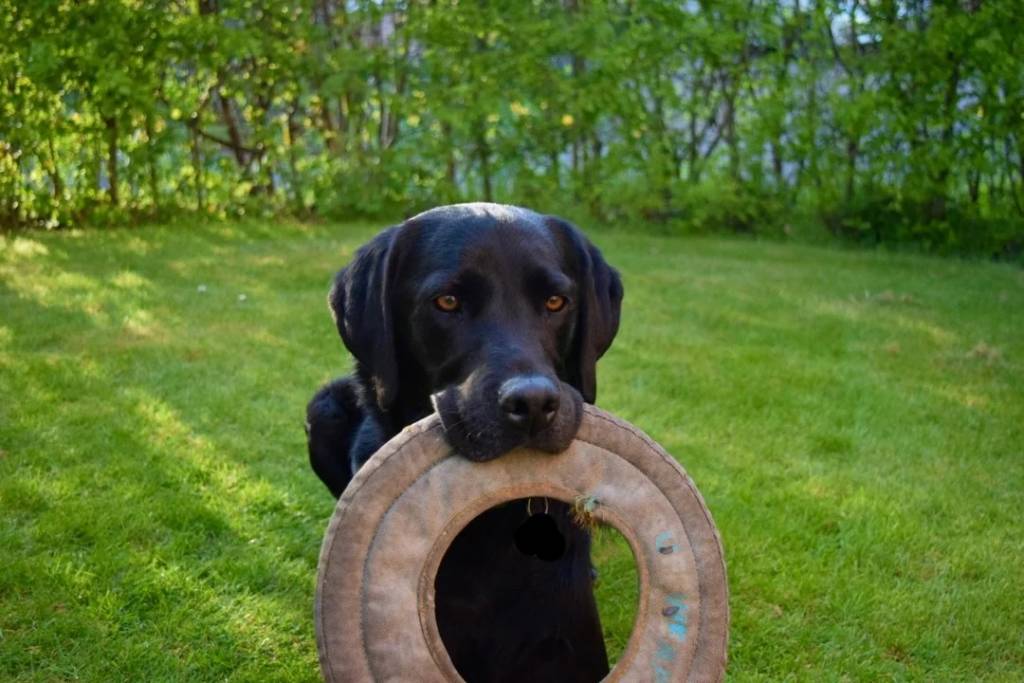 Un Labernois assis sur un terrain herbeux et tenant un objet dans la gueule