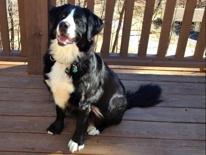 Un Labernois assis sur un plancher et portant un collier autour du cou