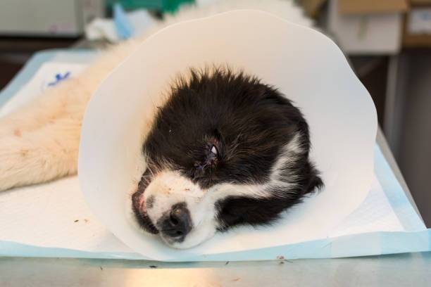 Un Labernois portant un carcan et allongé sur une table chez le vétérinaire
