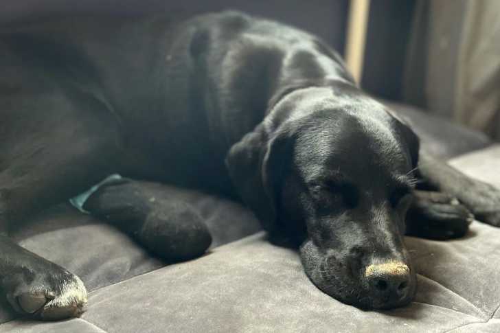 Un Labrador Corso allongé sur le côté avec sa tête reposant sur l’accoudoir du canapé