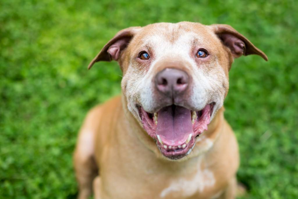 Un Labrastaff au pelage fauve, assis dans l'herbe