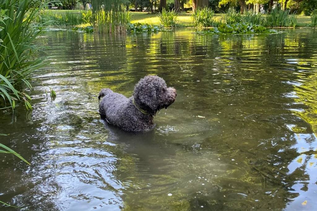 Un Lagotto Romagnolo marchant dans l'eau et portant un collier autour du cou