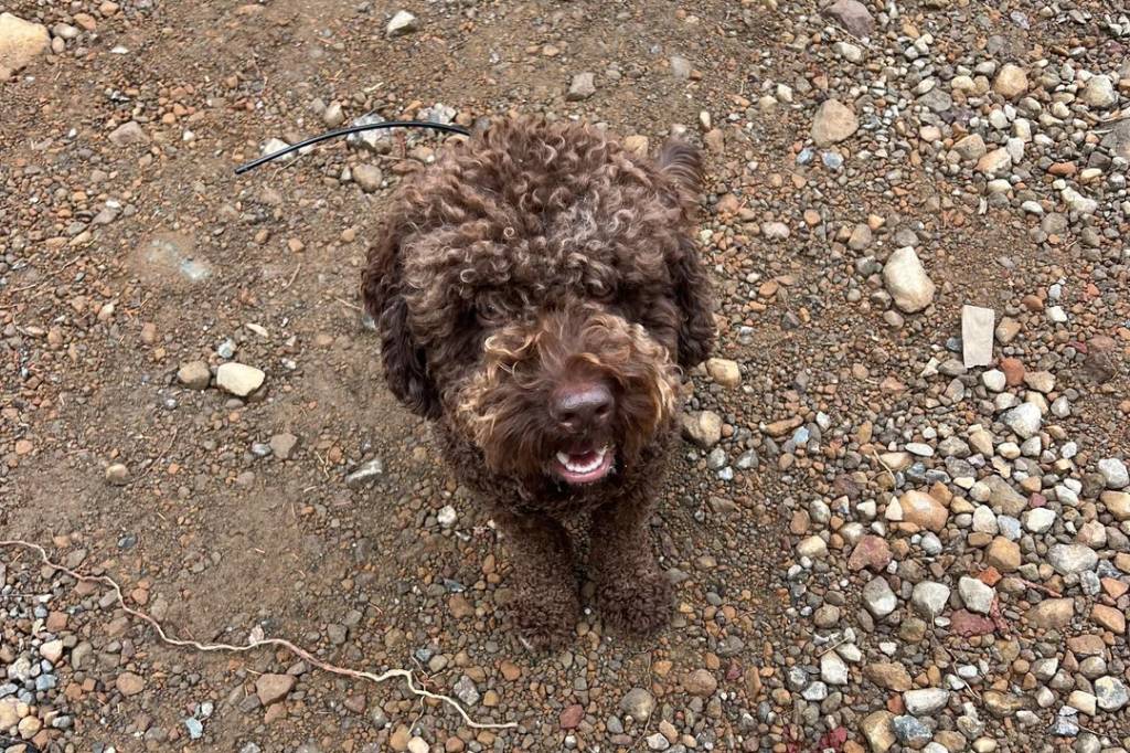 Un Lagotto Romagnolo assis et ayant la gueule légèrement ouverte