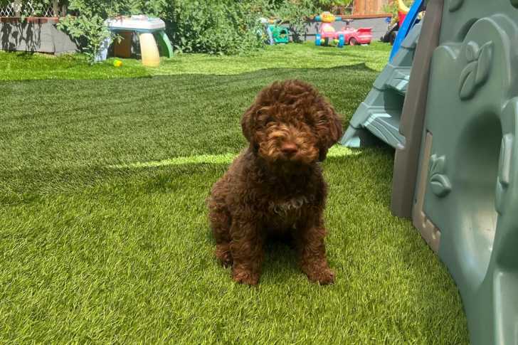Un Lagotto Romagnolo assis sur une surface gazonnée et regardant vers la caméra