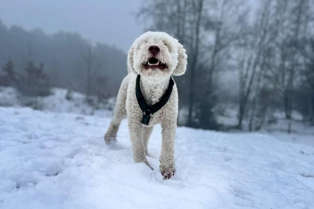 Un Lagotto Romagnolo portant un harnais et marchant sur une surface enneigée