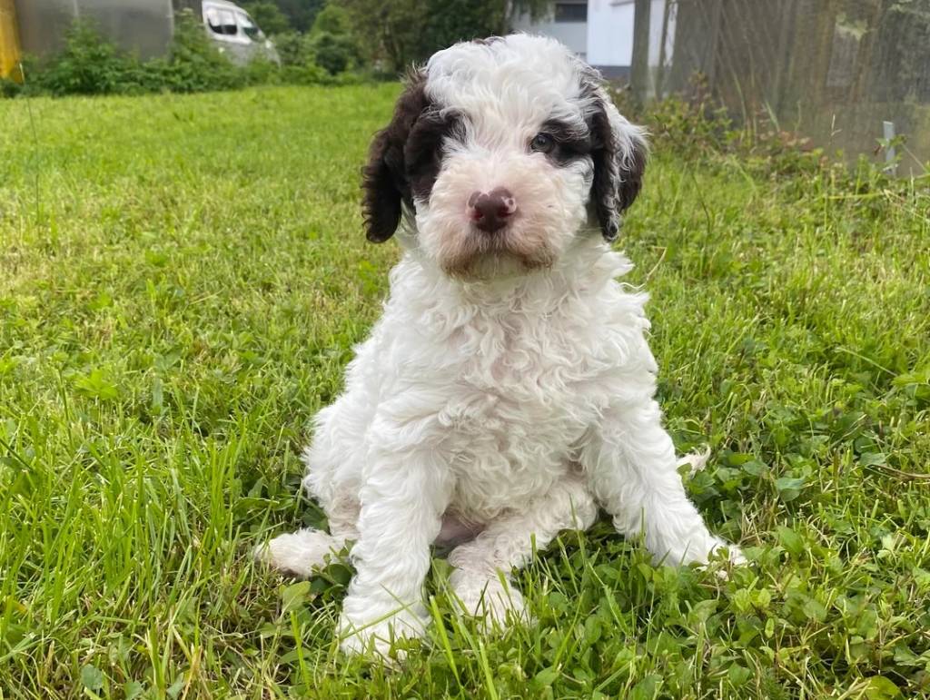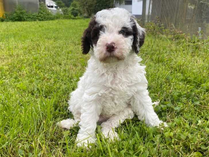 Un Lagotto Romagnolo assis sur un terrain herbeux et regardant vers la caméra