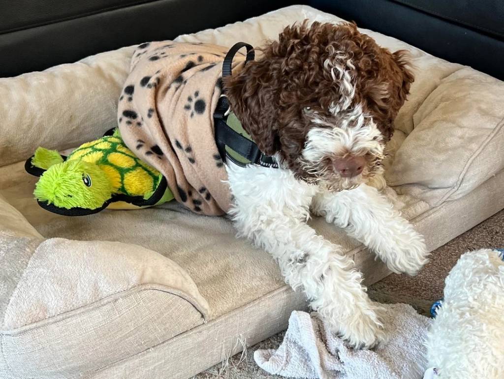 Un Lagotto Romagnolo allongé dans un panier et portant un harnais