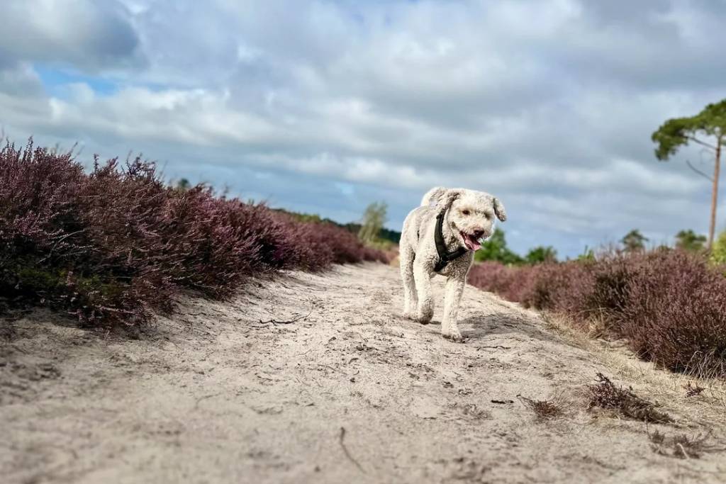 Un Lagotto Romagnolo marchant sur un sentier et portant un harnais
