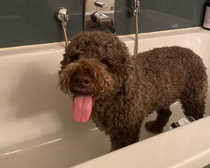 Un Lagotto Romagnolo dans une baignoire et tirant la langue