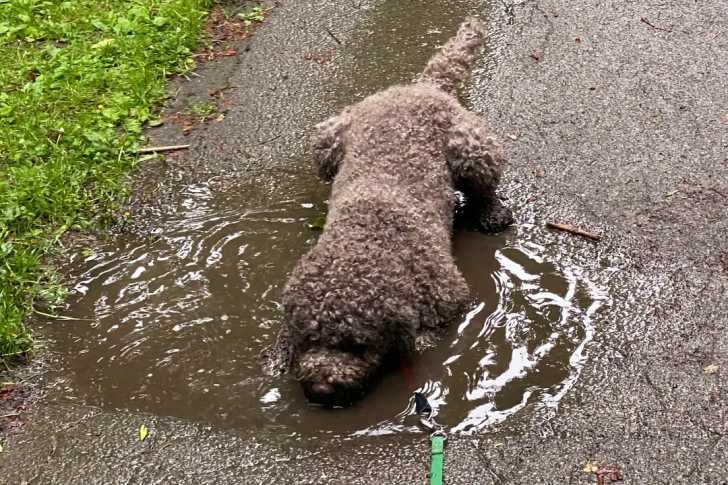 Un Lagotto Romagnolo s'hydratant dans une flaque d'eau et tenu en laisse
