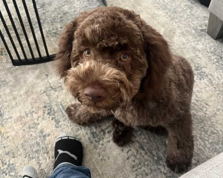 Un Lagotto Romagnolo assis sur une moquette