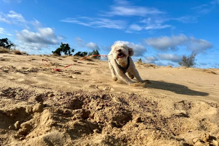 Un Lagotto Romagnolo courant sur une surface sableuse