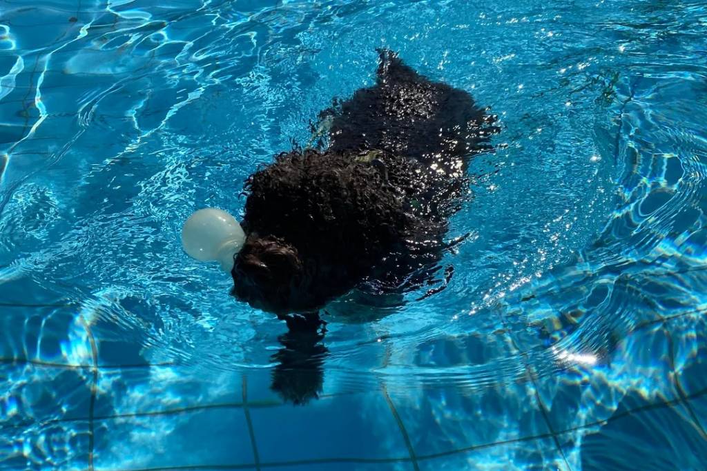 Un Lagotto Romagnolo nageant dans une piscine