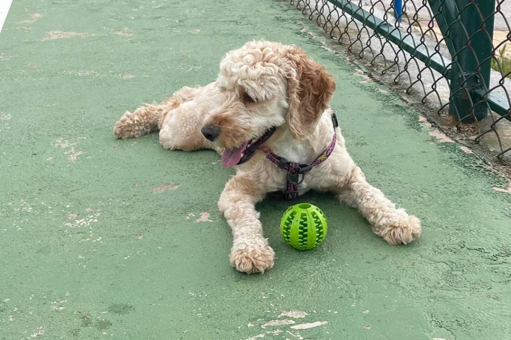 Un Lagotto Romagnolo allongé dans une cage et portant un harnais