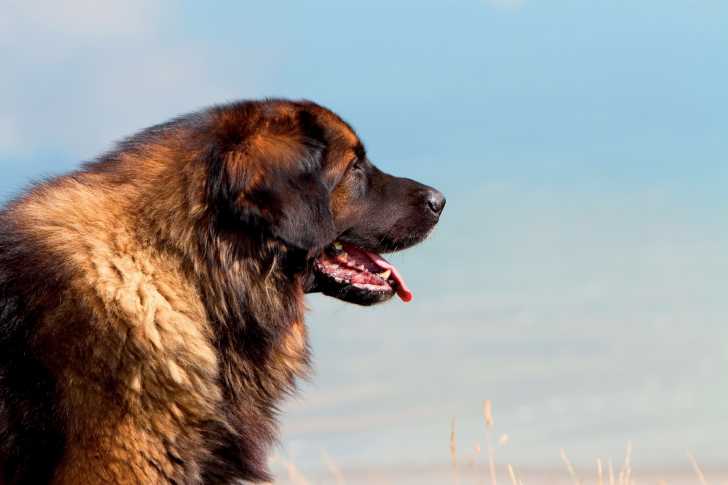 Le visage d'un Leonberg qui regarde le ciel en tirant la langue