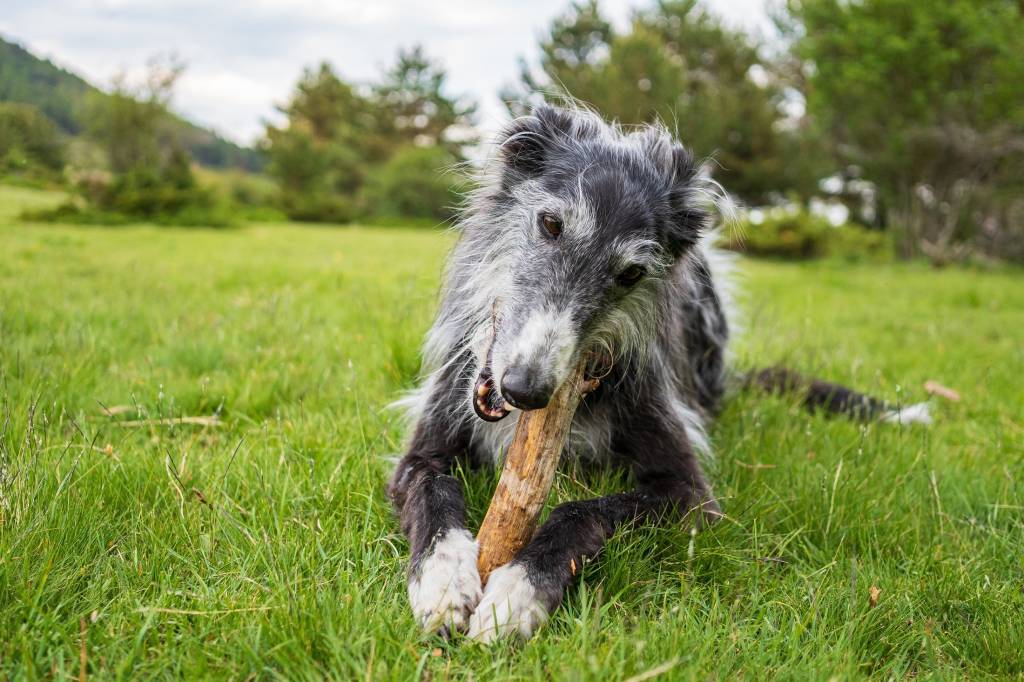 Un Lévrier Écossais joue avec un couple de Lévriers de Soie