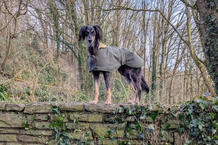 Un Lévrier de Soie sur un mur en brique et portant un habit pour chien