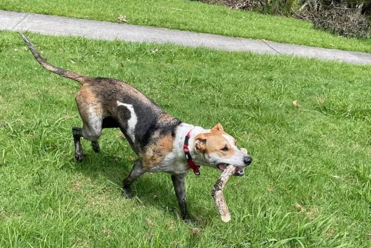 Un Lévrier de Soie portant un collier autour du cou et ayant un bâton dans sa gueule