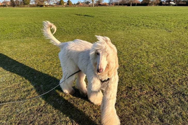 Un Lévrier de Soie marchant sur une surface gazonnée et qui est tenu en laisse