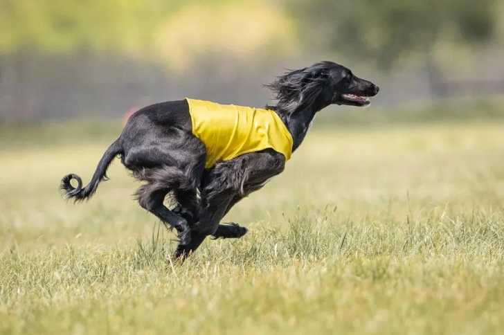 Un Lévrier de Soie courant sur un terrain herbeux et portant un habit pour chien