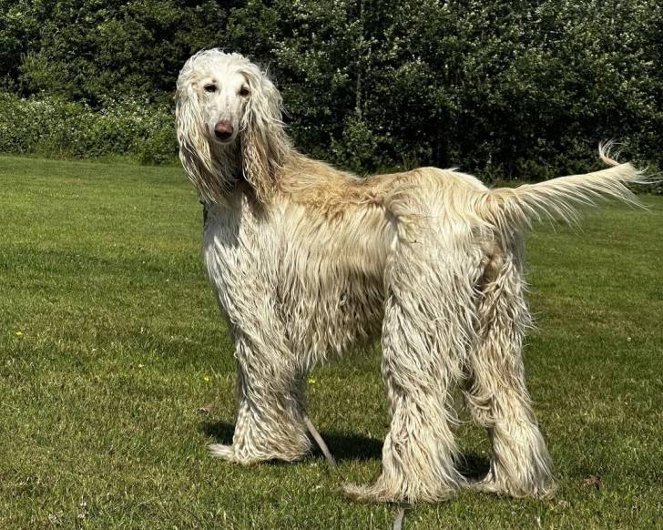 Un Lévrier de Soie sur une surface gazonnée et qui est tenu en laisse