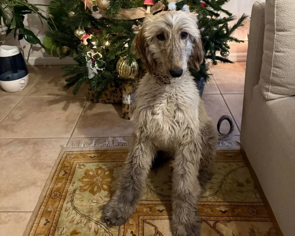 Un Lévrier de Soie assis sur un tapis et portant un collier autour du cou