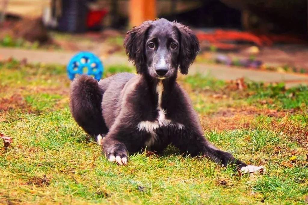 Un Lévrier de Soie allongé sur une surface gazonnée et regardant vers la caméra