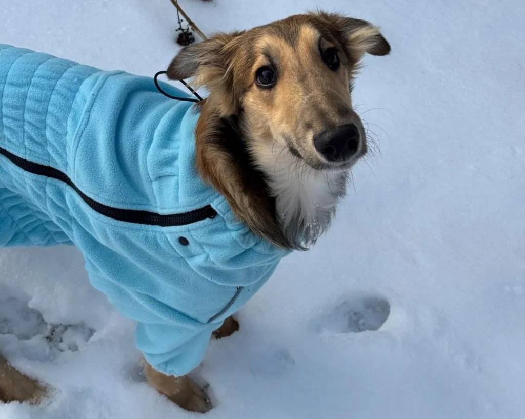 Un Lévrier de Soie sur une surface enneigée et portant un habit pour chien