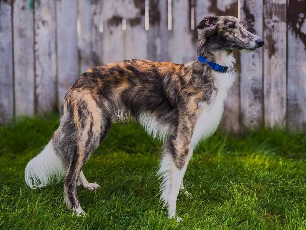 Un Lévrier de Soie sur une surface gazonnée et portant un collier autour du cou