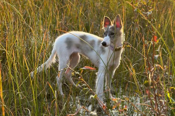 Un Lévrier de Soie sur une surface herbacée et portant un collier autour du cou