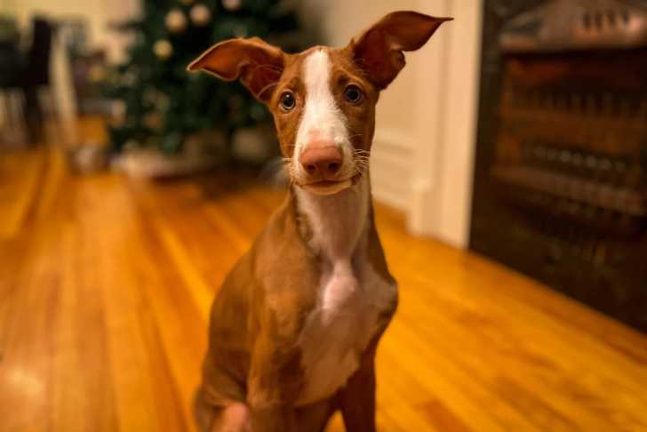 Un Taigan assis sur un plancher et regardant vers la caméra