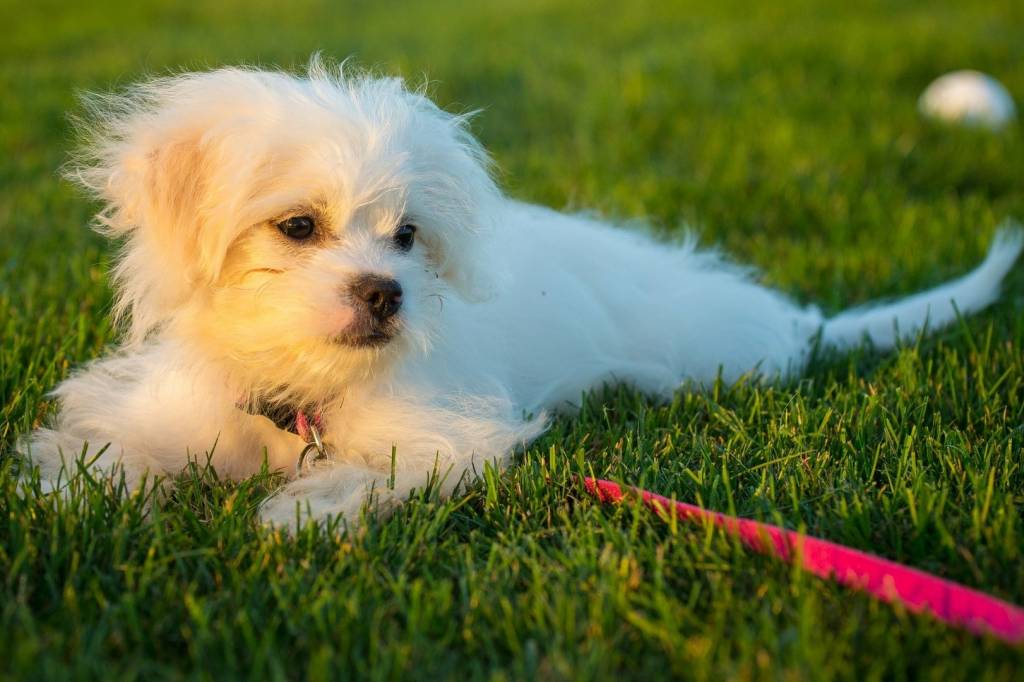 Un Lhatese allongé sur une surface herbacée et qui est tenu en laisse