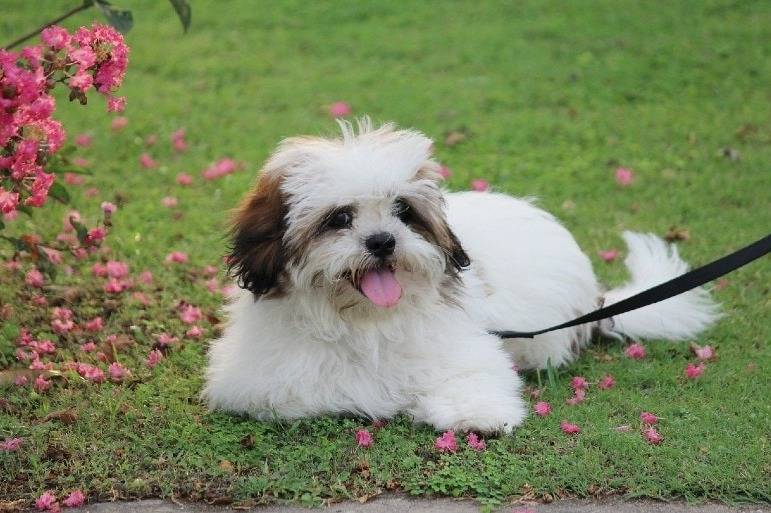 Un Lhatese allongé dans un jardin et qui est tenu en laisse