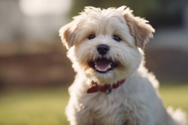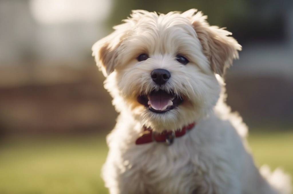 Gros plan d'un Lhatese au pelage blanc, tirant la langue et portant un collier autour du cou